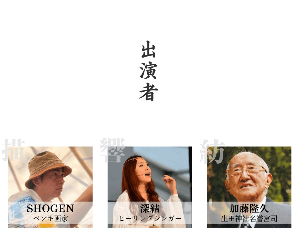 大震災の体験をスライドと共に振り返り、御祭神・稚日女尊と歩んできた“復興の物語”に触れます。さらに、祈り・芸術・言葉が交わり合う対話を通して、未来へ祈りをどうつないでいくのか――ここでこの時にしか生まれない特別なひとときを分かち合います。