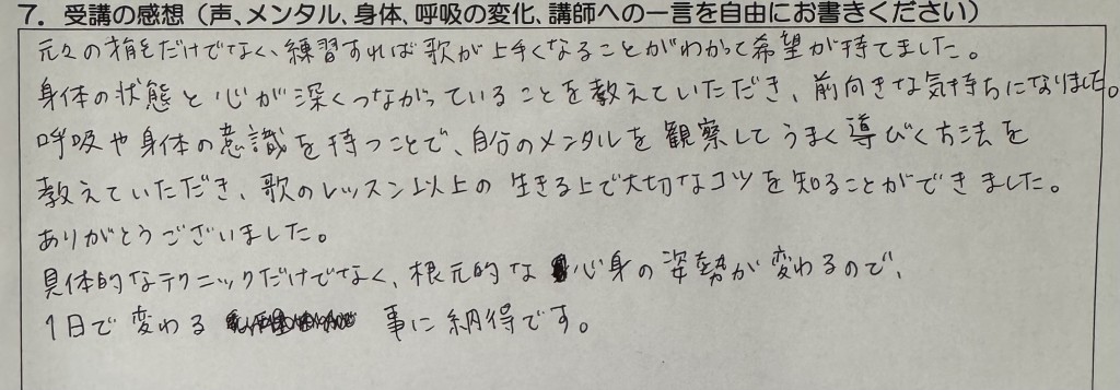 身体の状態と心が深くつながっていることを教えていただき、前向きな気持ちになりました。呼吸や身体の意識を持つことで、自のメンタルを観察してうまく導びく方法を教えていただき、歌のレッスン以上の生きる上で大切なコツを知ることができました。ありがとうございました。見体的なテクニックだけでなく、根本的な心身の姿勢が変わるので、1日で変わる事に納得です。”— 女性 30代