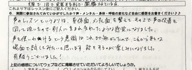 “レッスンを受講してみて声だけの意識ではなく身体と心(マインド)の変化と少しのイメージで、声の出方が見違える程変わり、感動しました!”— 女性 20代