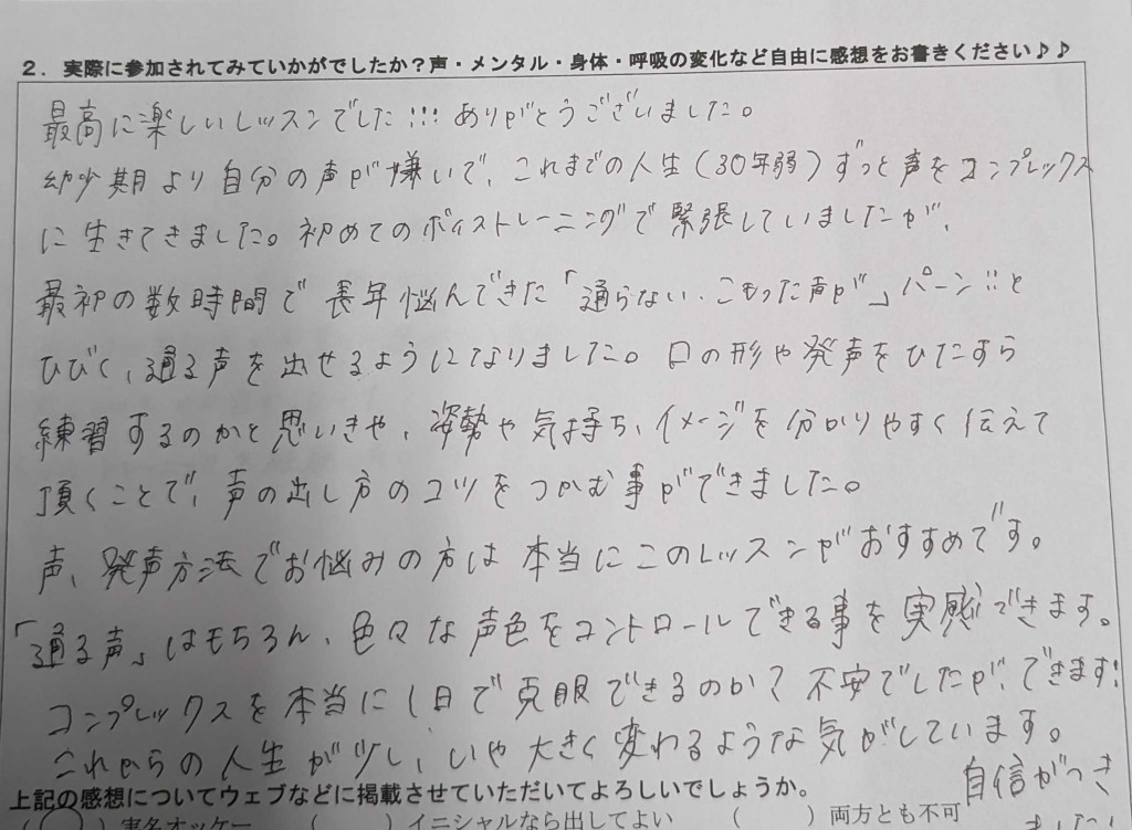 “声のレッスンというよりは身体面、メンタル面を整えて、その上で声の改善を図って頂いたので、別人に生まれ変わったような感覚になりました。声を使い分けるという意識はこれまで無かったので、これから色々な場面で試してみたいと思います。話をするのが楽しみになりました。ありがとうございました!声が小さいと悩んでいる全ての方におすすめします。”— 男性 40代