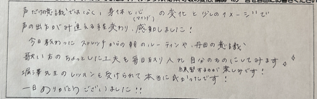参加された方々が口にするのは、「声だけでなく心まで変わった」という体験。歌を超えて響く“声の力”を実感された方々の声をお届けします。