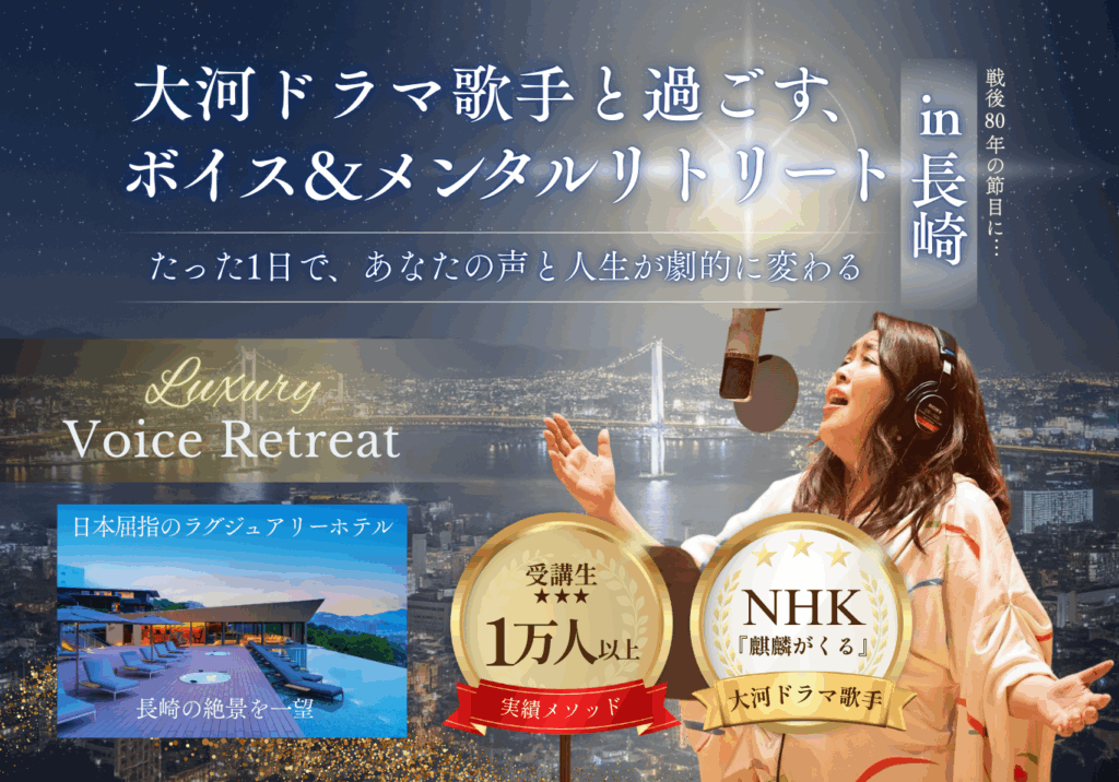 裏声も表声のように艶やかに響かせるこの発声法を、独自のメソッドで、わずか1日で体感することが可能です。